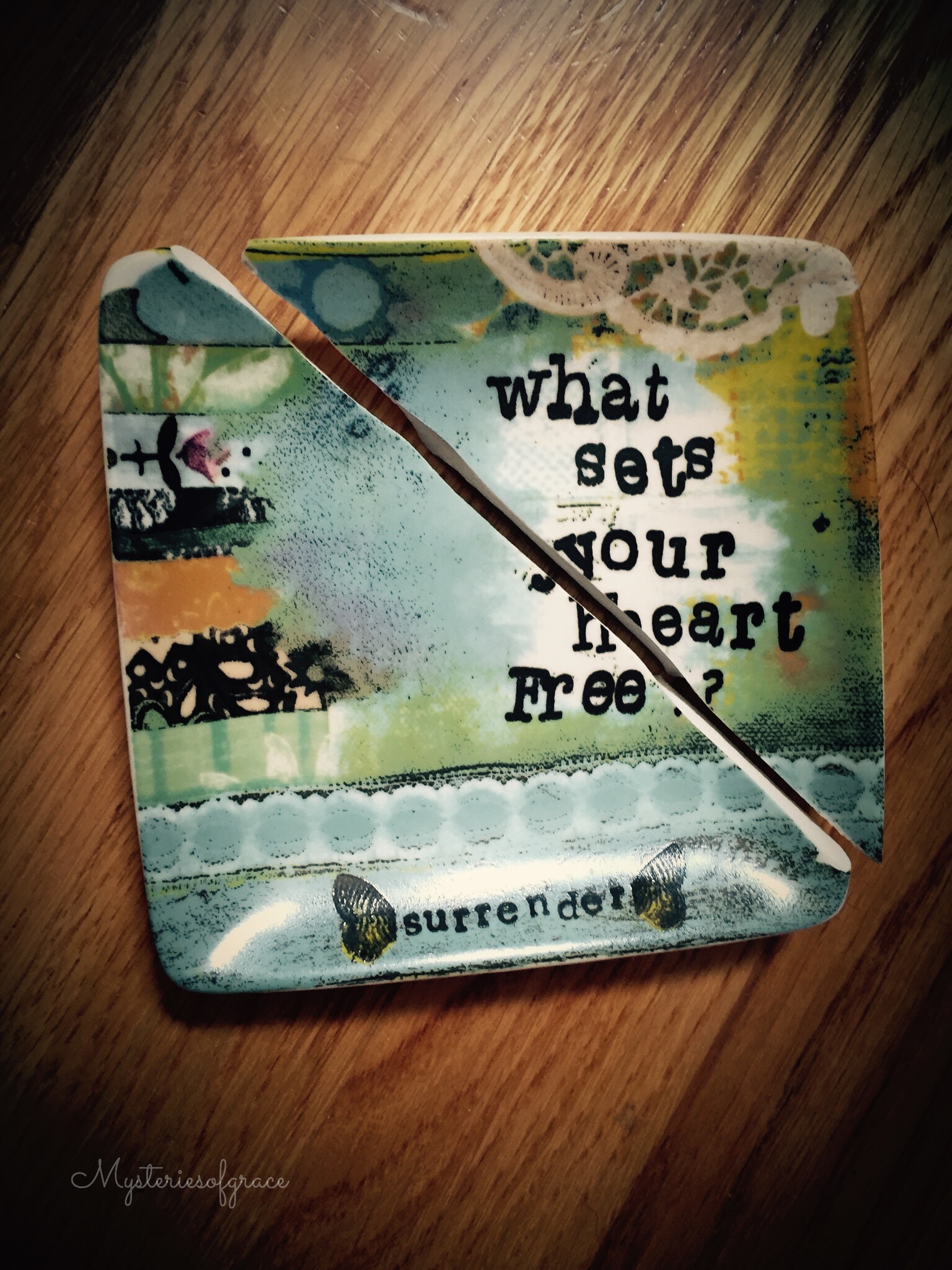 Well…It’s still just a small broken plate which many would have discarded; but it has found its new home on my foyer table: a reminder that we all have broken pieces and broken places, but also strength, beauty, and purpose. Even if it is simply to remind others that there is beauty and hope in each day. So today I am thankful that my life has intersected with others and, in our losses and brokenness, we have found common ground, connection, faith, and hope. Let me ask this: What sets your heart free?