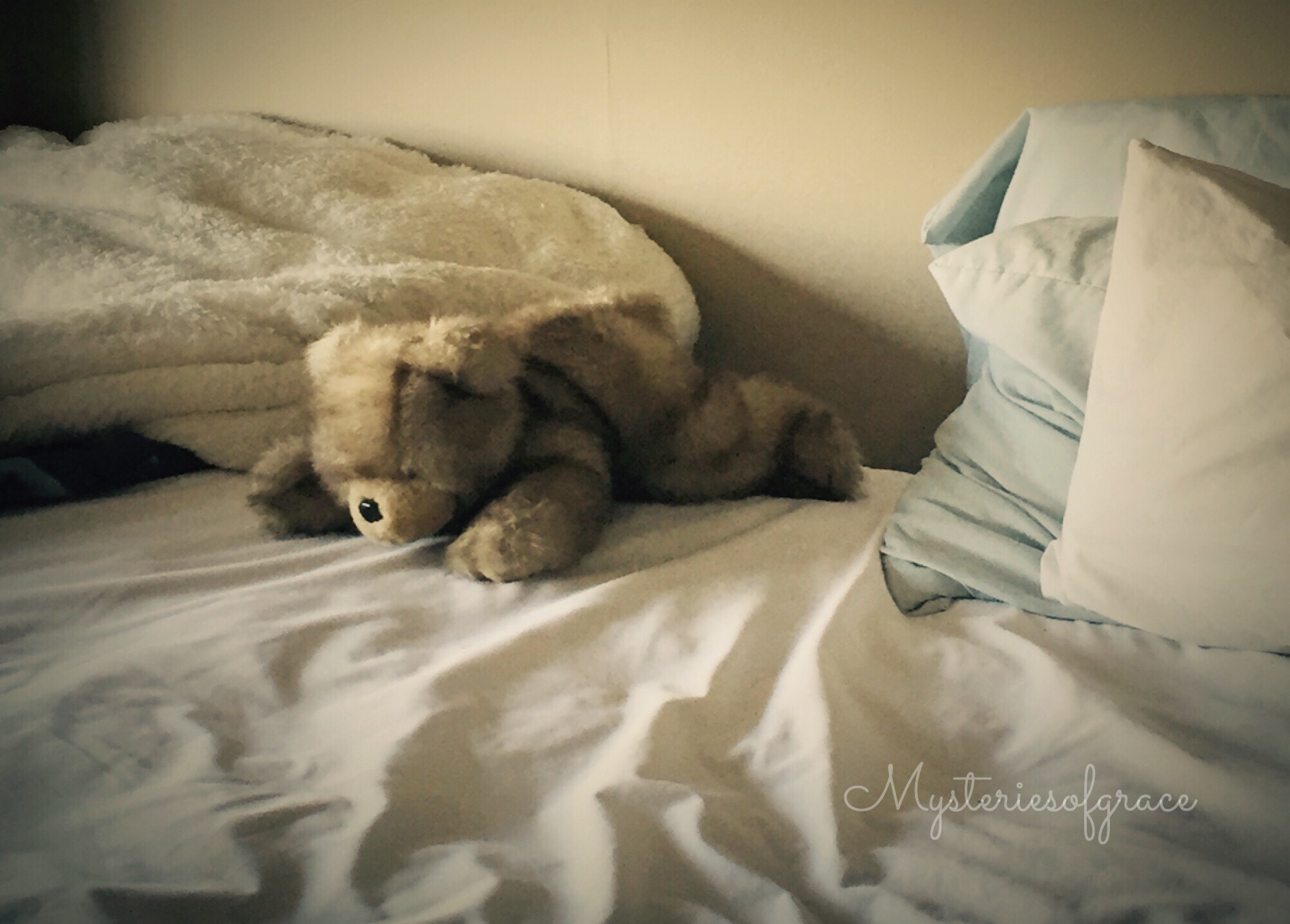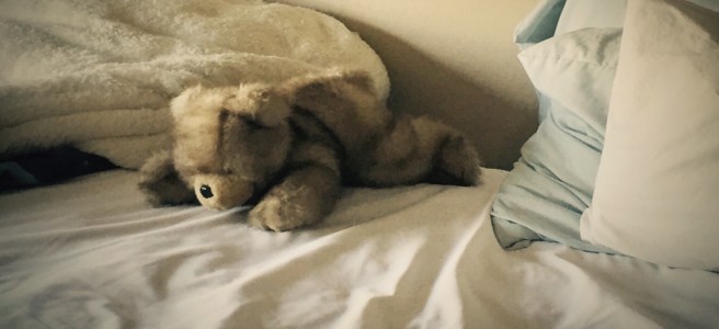 I was deep in the midst of a hectic day at work when the phone in my pocket announced the arrival of a new picture message… IMG_6701Sneaking a quick peek, I glimpsed an image that was instantly familiar, but definitely out of place. There in the midst of wrinkled sheets and crumpled pillows lay a warmly familiar fuzzy bear. Face down, paws outstretched, in comfort or in reverence, I don’t know. Relaxed. At home. Comfortable.